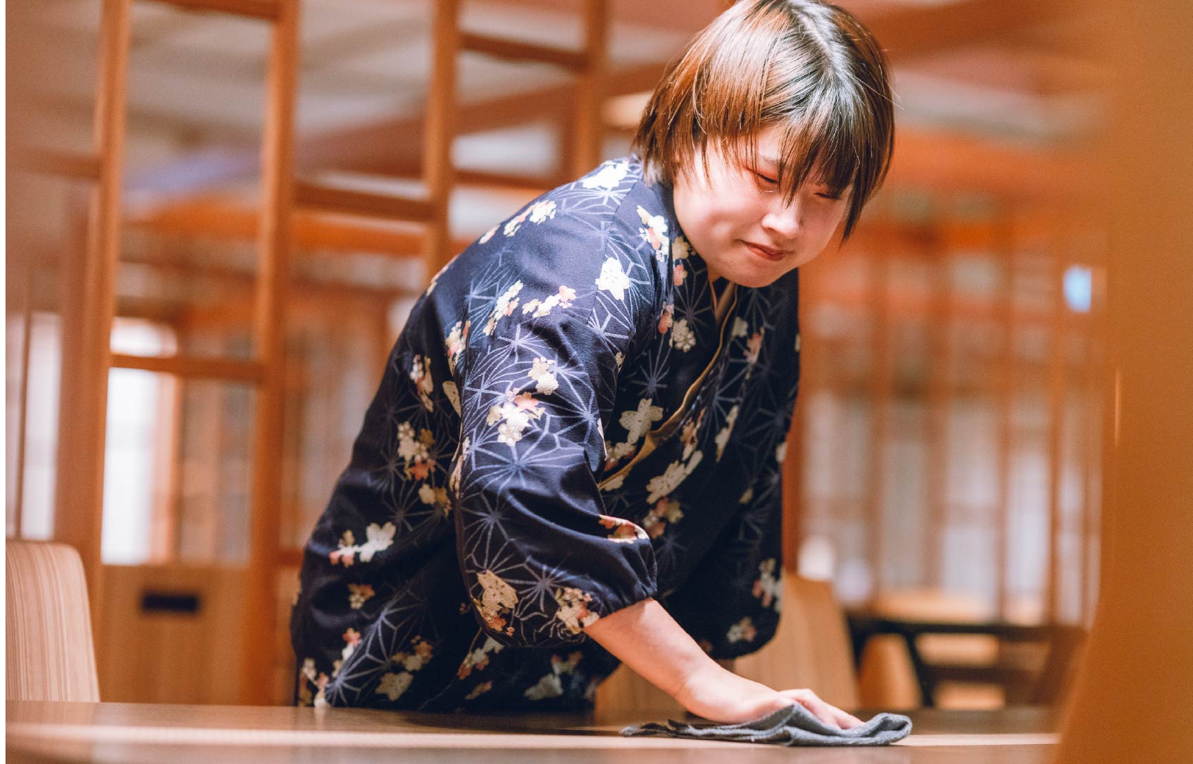 料理出し、フロント、ビュッフェ・客室清掃・清掃後の点検・売店業務・洗い場・布団敷といった幅広い業務をしています。
