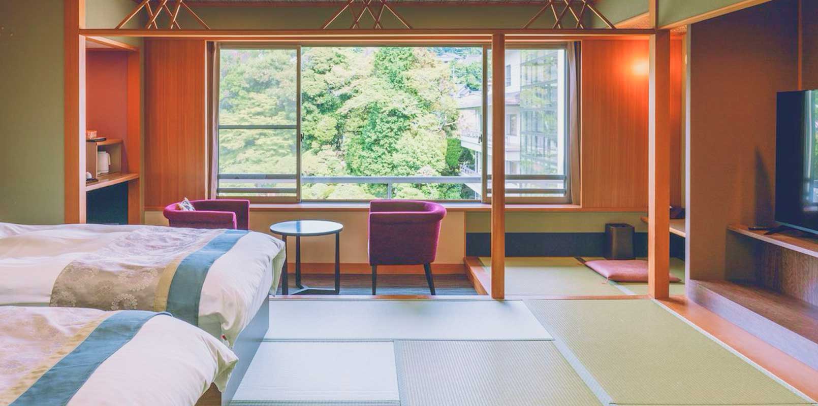 本館的日式客房能讓您感受到日本傳統的空間之美和寧靜。榻榻米的香氣和透過紙拉窗的柔和光線,治癒了旅途的疲勞。夜晚房務人員會為您準備好被褥,有別於一般的床鋪,享受與眾不同的日式住宿體驗。